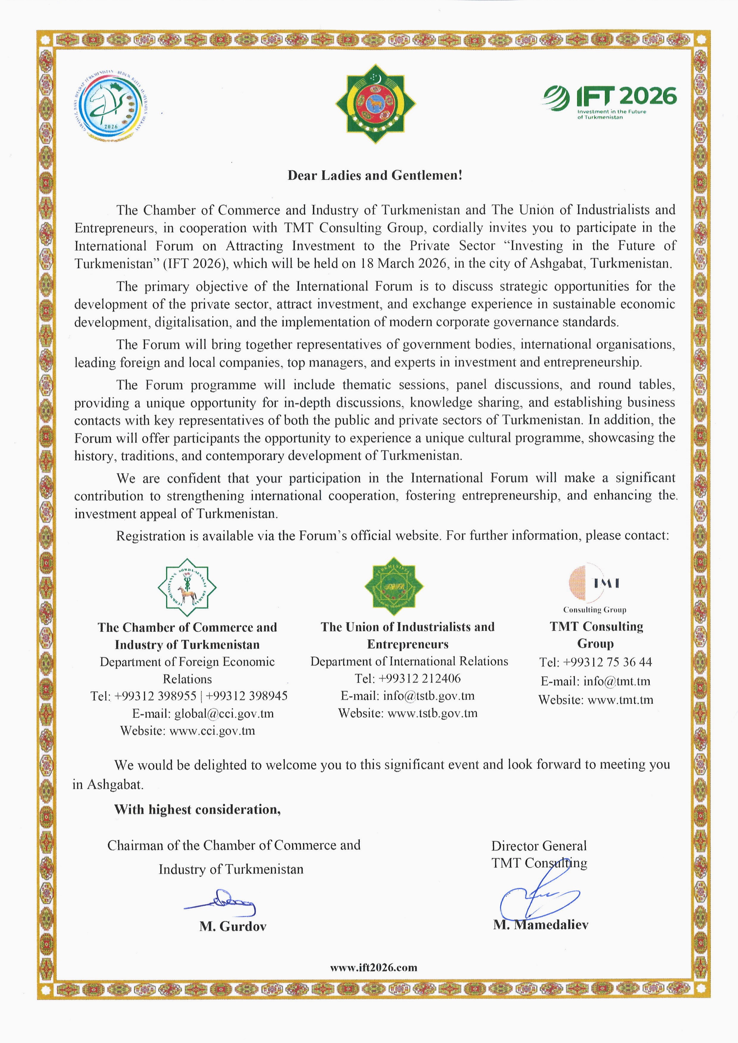 The International Forum on Attracting Investment into the Private Sector, ‘Investing in the Future of Turkmenistan’ (IFT 2026), will take place on 18 March 2026 in Ashgabat, at the Chamber of Commerce and Industry of Turkmenistan.