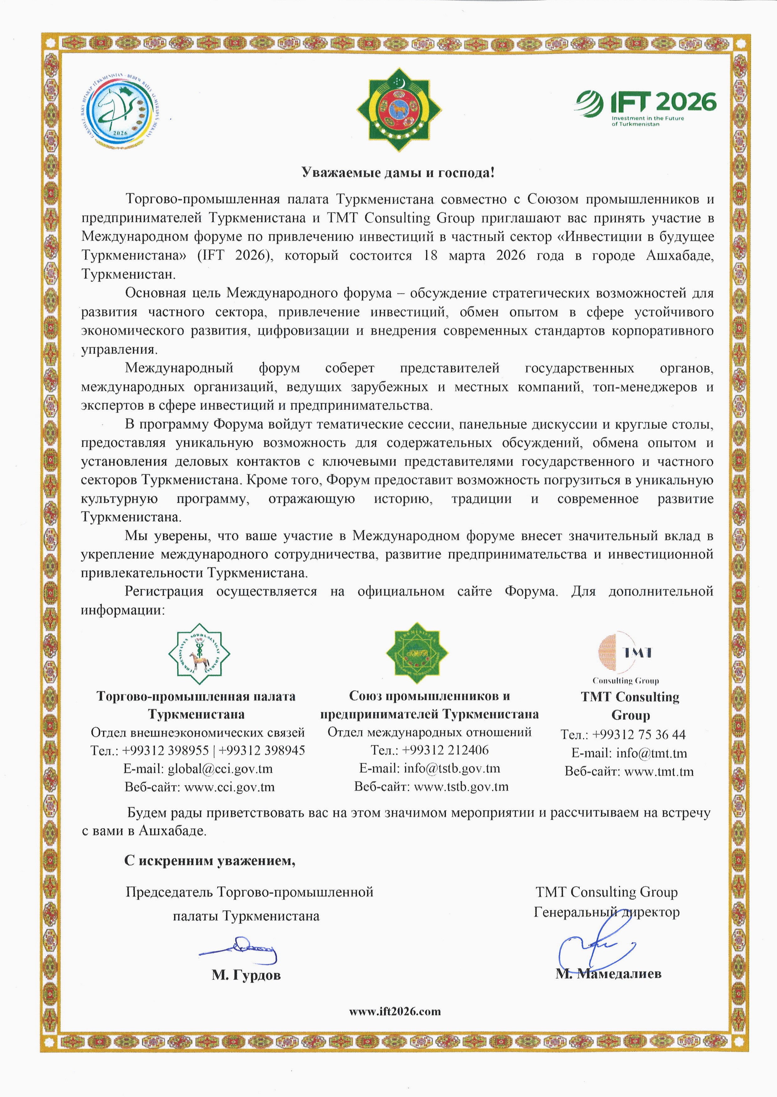 «Инвестиции в будущее Туркменистана» (IFT 2026) состоится 18 марта 2026 года в Ашхабаде, в здании Торгово-промышленной палаты Туркменистана.